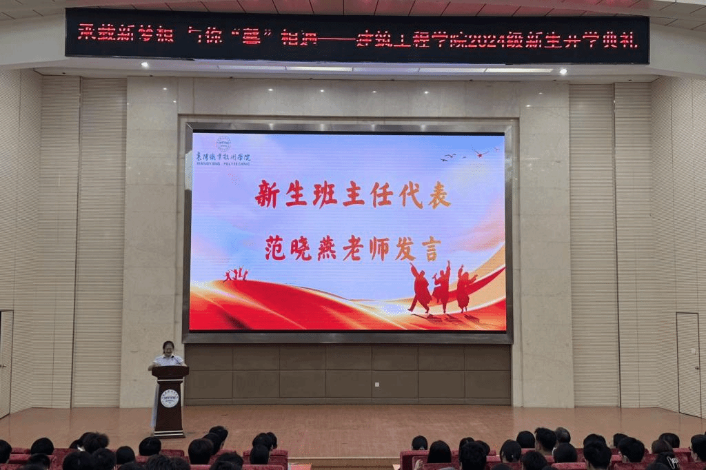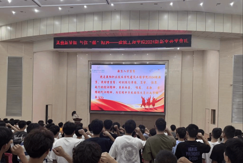 学生代表、工程造价 2301 班吴秋月同学分享了学习和生活经验,为新生们提供了宝贵的建议。新生代表、建筑装饰工程技术 2401 班黄紫妍同学发言,表达了对未来学习生活的憧憬和努力奋斗的决心。随后,黄紫妍带领全体新生进行了入学宣誓。