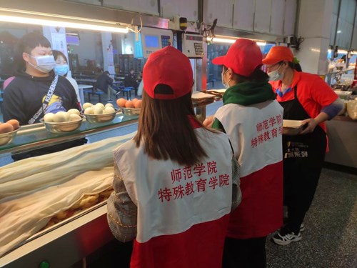 11月5日早6点,月亮还悬挂在天空,师范学院(特殊教育学院)第五批12名劳动体验队员已在学校食堂知恩堂的各个岗位上开始了一天的“工作”。