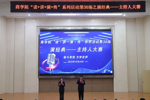 为丰富校园文化,活跃大学生校园生活,为学生提供一个展示自我、挑战自我的舞台,10月24日晚7:00,由商学院主办的“‘读·讲·演·传’系列活动第三十场之演经典——主持人大赛”在图书馆2号报告厅举行。商学院党总支书记王建宏、教学副院长唐卫东、学工副院长梁光源、就业办主任杨帆、部分学工老师及2023级新生参加此次比赛。