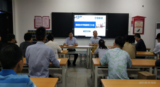 5月10日晚7点,信息技术学院召开全体教职工大会。会议由党总支书记汤才虎主持。全体教职工、合作企业美和易思公司全体讲师及全体外聘教师参加会议。