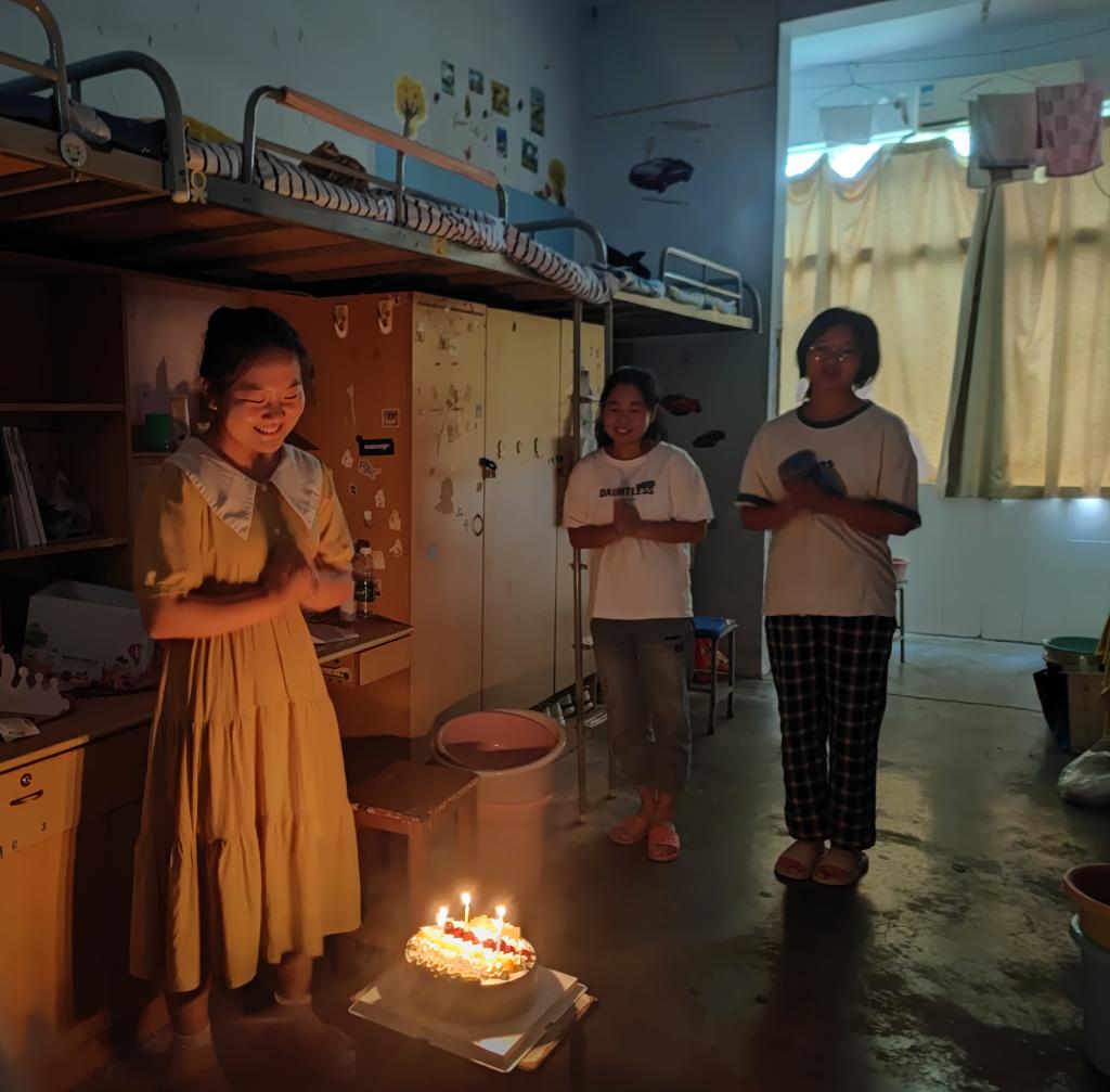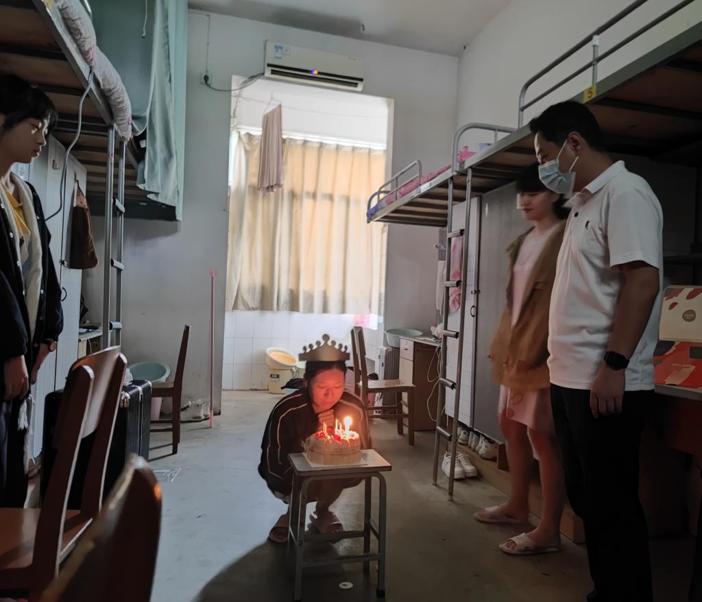 走访前,老师们了解到临床2201班的陈飞羽和中医2201班的蔡晓月正值18岁生日,且二人都来自外地,所以为她们精心准备生日蛋糕,并勉励同学们珍惜大学好时光,学真本事、砥砺品质、志存高远。