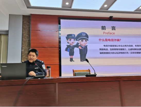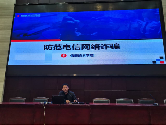 领导重视、目标明确、保障有力。在学校保卫处、学工处等职能部门的指导下,信息技术学院联合隆中派出所,有针对性地研究了近期发生的电信网络诈骗问题,查找规律,制定计划,逐步实施。针对在校学生安全防范意识较为淡薄的特点,重点对他们进行预防网络电信诈骗的教育,促使学生形成防骗意识。
