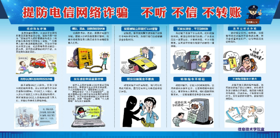 为了贯彻落实习近平总书记对打击治理电信网络诈骗犯罪工作精神,进一步提高师生的防诈骗意识,预防和减少诈骗案件发生,做好防电信网络诈骗示范点的引领带头作用,信息技术学院近期开展了防范电信网络诈骗系列宣传活动。