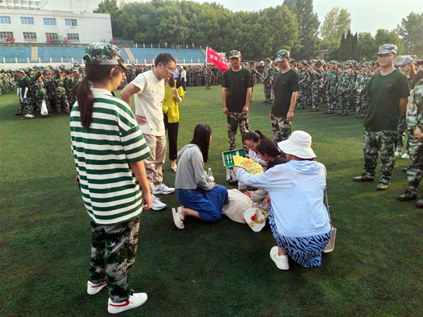 正在军训现场的师范学院学工科科长张凤、教务科科长汤宇,党员教师李也许、刘颖君、何林杰以及特殊教育2201班班主任张明媚等听到求救声后迅速赶到现场。老师们有的去喊医生,有的给晕倒学生扇扇子,有的一直在安慰学生,有的给晕倒学生喂水,跟训学生志愿者也积极配合老师开展救助工作。三分钟后,医务室医生赶到现场给该生喂下藿香正气水,辅导员何林杰将学生背到医务室,请医生作进一步治疗。“我喊了120,马上就到,你们得要跟个人去。”值班医生边打电话边说。一直守在学生旁边的张明媚老师急忙举起了手“我去,我去”。因采取措施及时,经过系列检查,医院医生表示该生无大碍,此时学生的脸色也明显好转,呼吸等回归正常。
