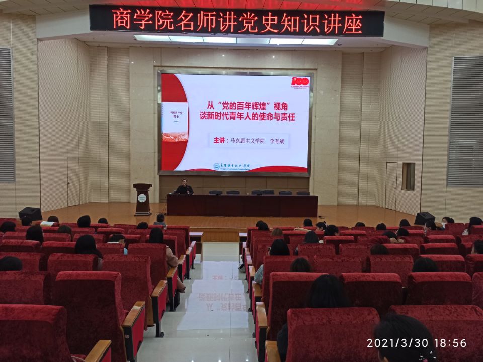 3月30日晚7点,商学院在图书馆二号报告厅举办党史知识讲座。商学院学工科科长梁光源,2019级、2020级全体入党积极分子参加。马克思主义学院副院长李有斌主讲。