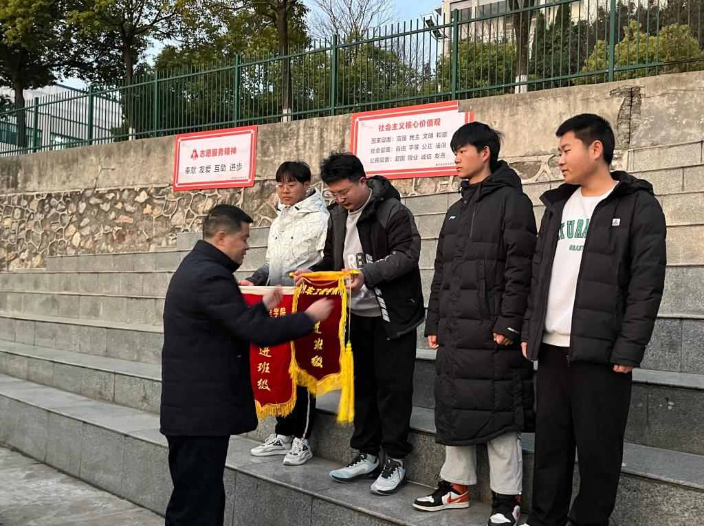 早训中,学工科科长朱杰对开学以来工作进行总结,宣布上学期信息素养大赛获奖情况;团总支负责人孙兆轩宣读表彰上学期“最美运动人”文件。