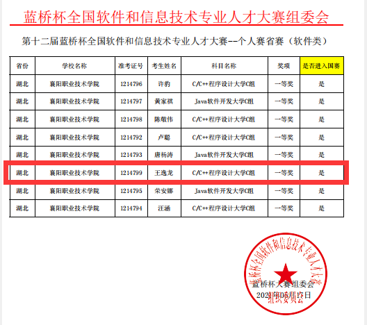 大一开始,在班主任田勇和同学们的鼓励下,王逸龙选择了进入大学以来的第一次挑战——参加“第十一届蓝桥杯全国软件和信息技术专业人才”大赛。虽然所学计算机知识并不多,遇到了许多尤其是对新手不友好的难题,但他无所畏惧,奋发图强,刻苦攻克一个一个困难。4月中旬,他参加第十一届蓝桥杯全国软件和信息技术专业人才大赛湖北赛区比赛,获得一等奖;6月初,他代表学校参加第十一届蓝桥杯全国软件和信息技术专业人才大赛,获得国家三等奖。王逸龙用优异的成绩证明了自己,也将继续在蓝桥杯大赛中续写辉煌,为校争光。