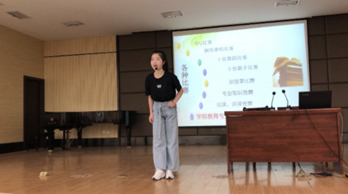 来自学前教育1701班的陈芸霞和1707班的郭文慧同学现场向学弟学妹们展示了故事讲述、幼儿歌曲弹唱与歌表演。二人精彩的演绎赢得了现场阵阵掌声。这有效地提高了新生对所学专业的认识,也为他们今后的学习指明了方向。