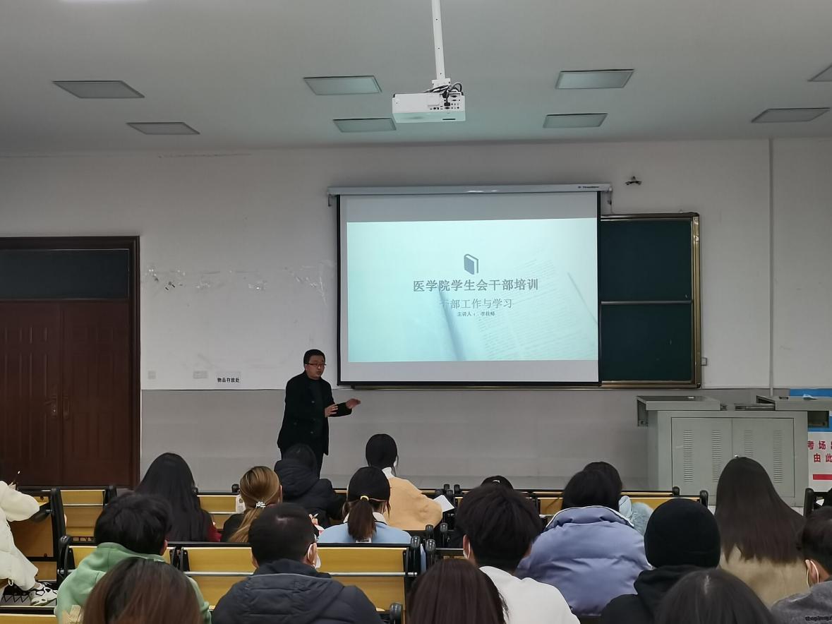 11月22日晚,医学院学生会指导老师李桂峰在惠济楼阶二教室为学生会干部开展“学习与工作”专题解读会。