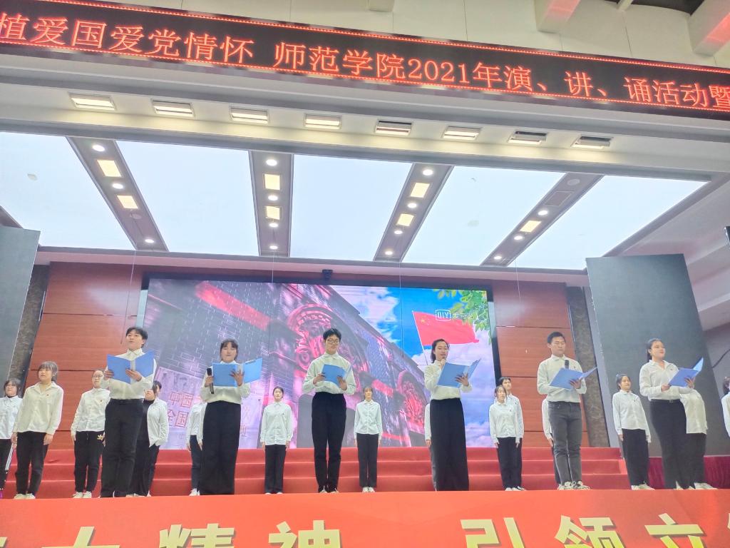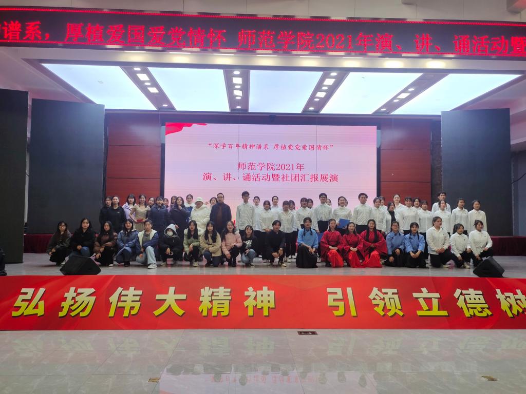 12月16日晚,师范学院在智能制造学术报告厅举办“深学百年精神谱系 厚植爱党爱国情怀”主题演讲诵暨2021年社团汇报展演活动。师范学院党总支书记张丹、院长刘红新、副院长彭建设等出席活动。