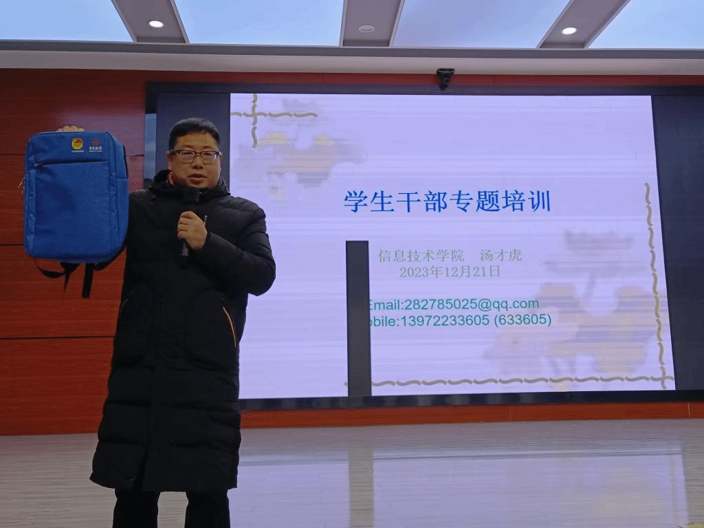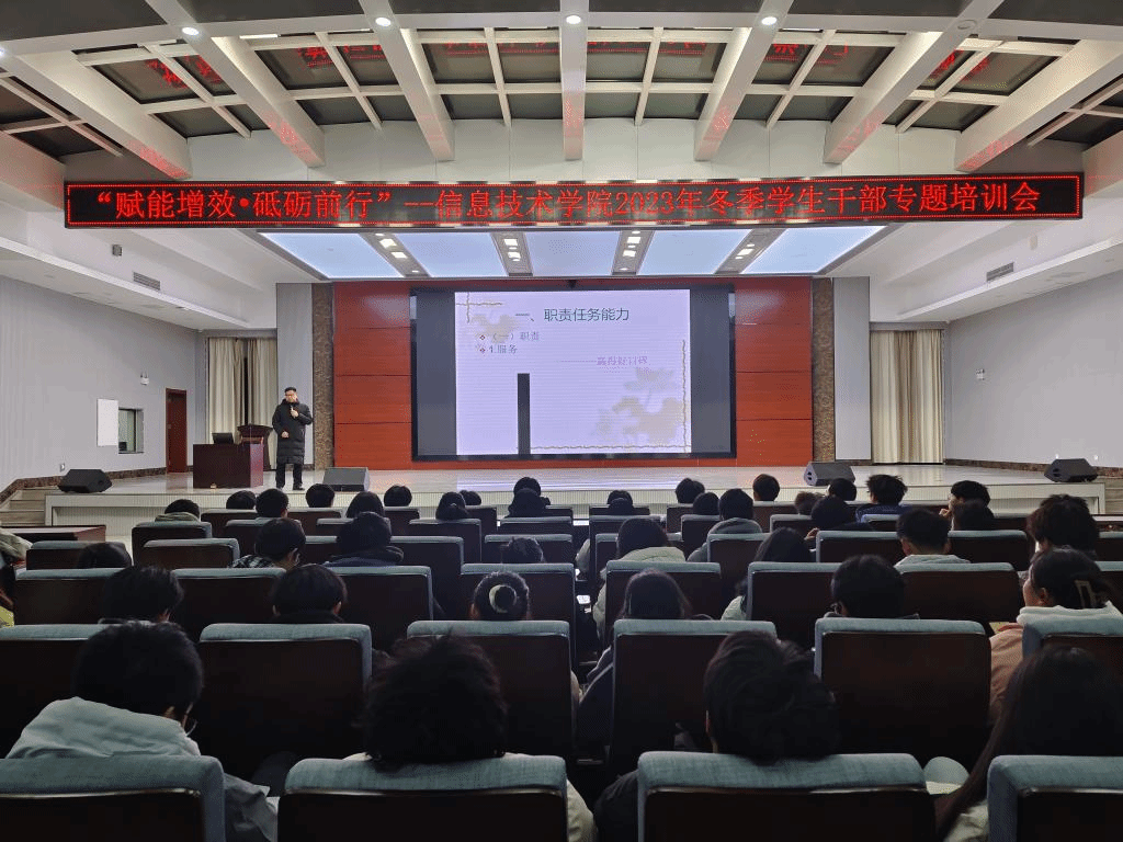为进一步加强学生干部队伍建设,增强学生干部的组织力、凝聚力、战斗力,全面提高学生干部的整体素质,12月21日,信息技术学院在智造·工业中心A栋学术报告厅召开“赋能增效·砥砺前行”2023年冬季学生干部专题培训会。信息技术学院党总支书记汤才虎、副院长高延伟,学工科长徐琛,辅导员刘俊毅、胡杨茗荟及全体学工人员出席培训会。
