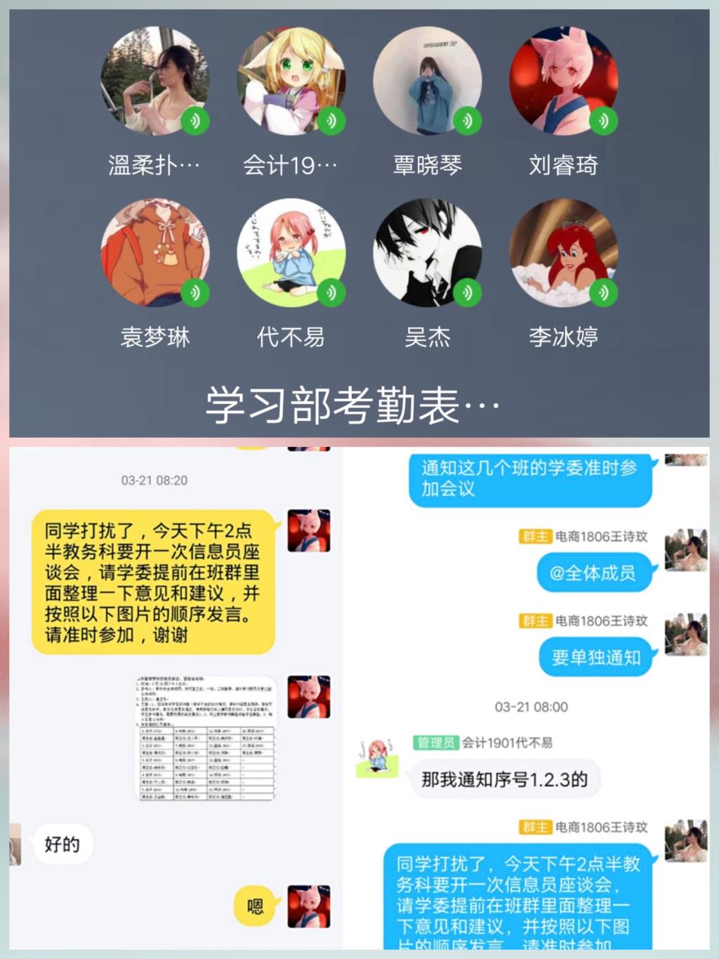 学习部干部深知,要做好老师与同学之间的桥梁。网上开学前夕,他们以最快的速度,分工搜集开课班级线上教学信息,为老师实施线上教学提供便利。线上教学期间,学习部成员轮流值班,每天检查、收集、汇总当天学习情况,提供第一手教学信息反馈资料。