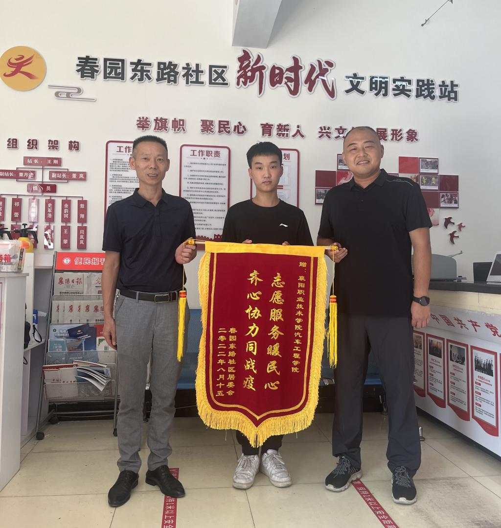在支部全体党员老师的带领和感召下,越来越多的学生自愿加入到活动中,奉献着自己的光和热。赵昆老师所带机电一体化技术2101班的翟文强便是其中的佼佼者。因为表现突出,春园东路社区居委会特地制作锦旗,写来感谢信,感谢翟文强的无私奉献。