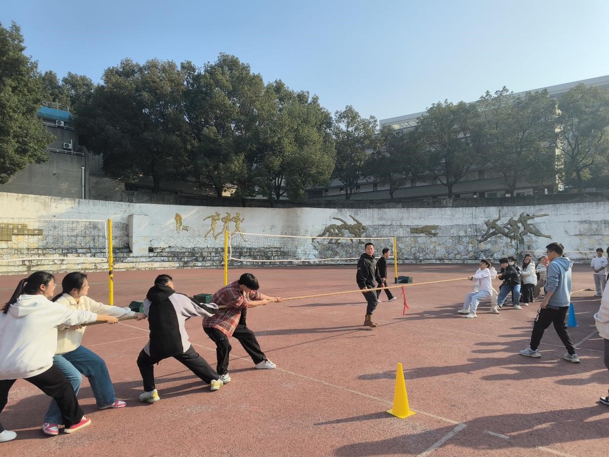 在两名辅导员的带领下,学生干部参加“击鼓颠球”“开网捕鱼”“集体拔河”等互动游戏。大家积极交流,在丰富多彩的活动中打开心扉,相互熟识,团结协作。“集体拔河”更是将本次活动推向高潮,现场气氛热烈。