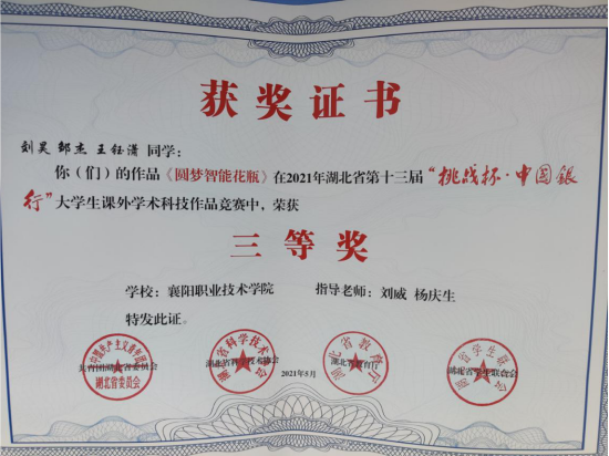 第十三届“挑战杯”大学生课外学术科技作品竞赛日前揭晓,信息技术学院学生刘昊、邹杰、王钰潇的作品《圆梦智能花盆》获三等奖。