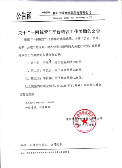 11月16日,我院就业办获悉,襄阳市零壹物联科技有限公司对参与“一网统管”平台培训的工作人员予以表彰,信息技术学院实习生王雨凤、李美云、李肖祥分别获得前三名的好成绩。