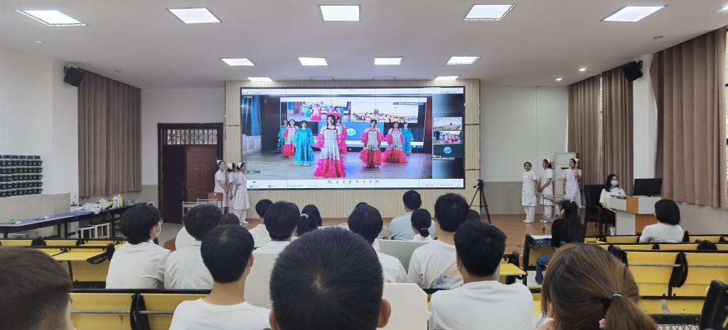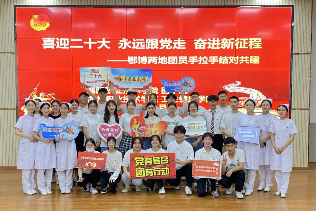 优秀团员代表医学院口腔2113班张立果、检验2001姚若晴分别与博职卫生健康学院护理21104马海波、护理21109穆婉玉线上结对。随后,博职卫生健康学院带来民族舞蹈《有这么一个地方》、诗朗诵《读中国》,医学院带来《奉献》护理礼仪展示。结对学生真挚的话语,别样的民族风情舞蹈,温暖了两地青年,拉近了鄂博的距离。