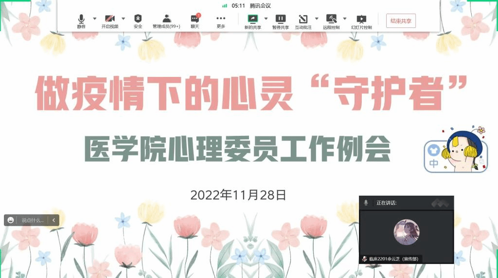 11月29日,医学院在腾讯会议召开了以“做疫情下的心灵‘守护者’”为主题的心理委员工作例会。院部心理辅导老师房莹主持会议,全体心理委员参会。