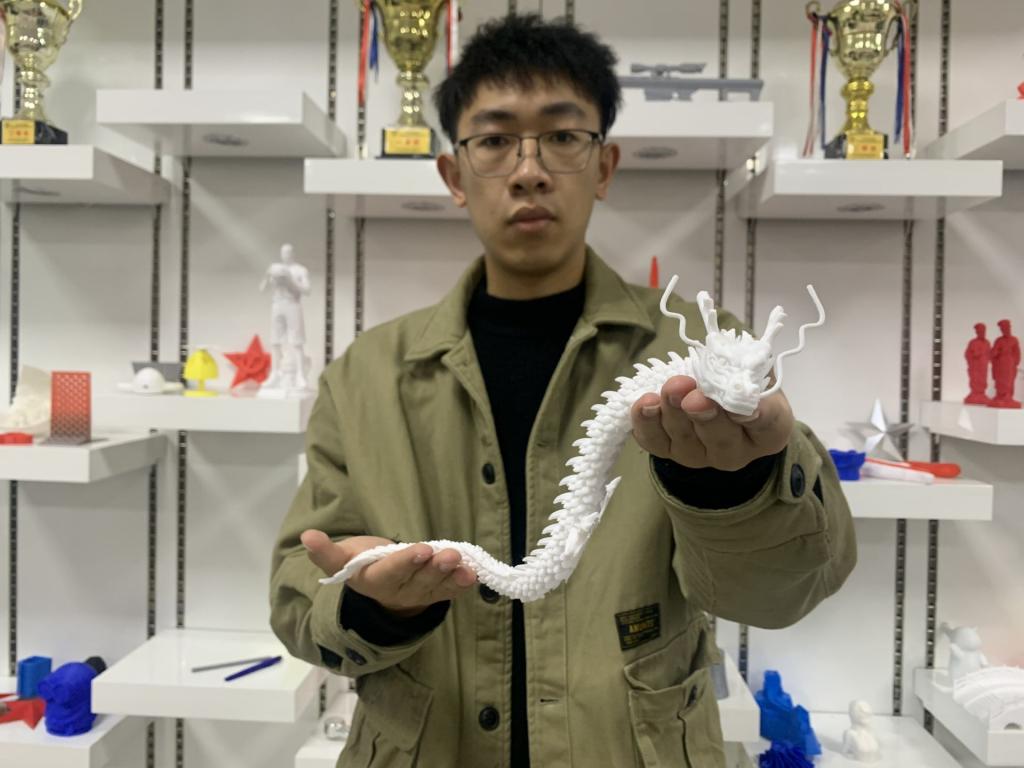 12月20日,汽车工程学院机械创新创客空间学生蒋海波(机械A1901班)利用3D打印FDM工艺,制作了一条活动龙,用此种形式迎接即将到来的2022年。