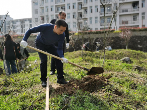师生同行,共植一抹绿。当天中午12点半,学校副校长章伟,学工处处长但耀卿、学工处副处长赵良虎,师范学院党总支书记张丹、院长肖尚军,以及全体党员教师和班主任带领结对学生,来到桃李园开展植树活动。活动中,师生一起挽起衣袖,拿起锄头,为一棵棵新树苗安置“新家”。师生一起植树,不时交流近期学习和生活情况,现场传来阵阵欢声笑语。不一会儿功夫,原本略显空旷的桃李园就增添了95株小树苗,显得生机勃勃。