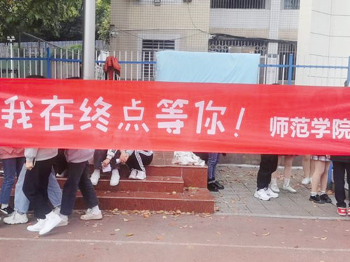 为营造比赛氛围,师范学院在赛道的13个集合地点分别拉上横幅和宣传标语。