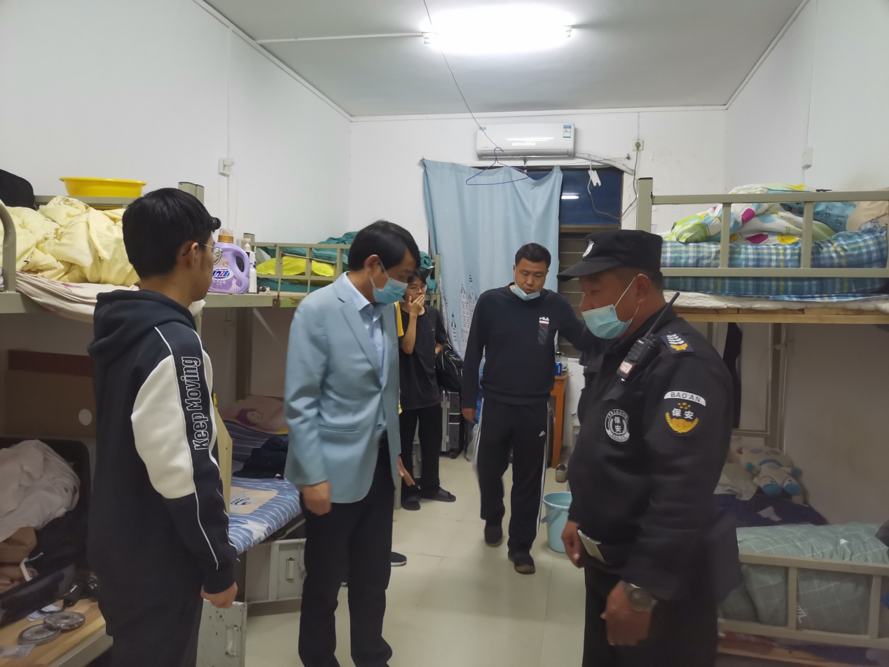 10月24日晚上8点,为落实学校关于疫情防控工作的部署和要求,进一步做好常态化疫情防控工作,深入了解学生在寝室的学习生活状况及存在的问题与困难,提升学生住宿安全防范意识,公共课部党总支书记陈建波带领班主任联合学校保卫处,到学生寝室走访慰问在校学生,开展疫情防控安全隐患排查及常规卫生检查。