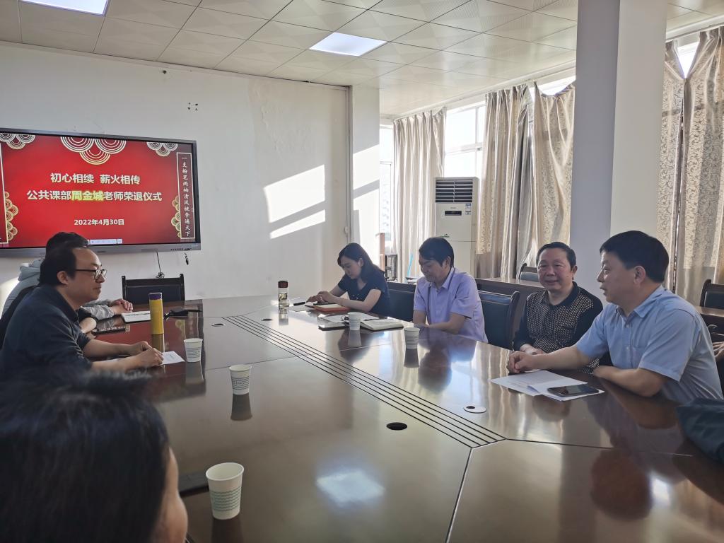 “三十九年过去,弹指一挥间……”5月5日下午,公共课部数学教研室老师周金城发表退休感言,“感谢公共课部,感谢数学教研室为我举办这个特殊的仪式。此刻,我感慨万千。39年前,满怀憧憬走上工作岗位,如今已两鬓染霜,迈入退休人员队伍。回忆工作的点点滴滴,辛苦但乐在其中,和学生在一起心态年轻,收获幸福……最后祝愿学校早日升本成功,祝愿公共课部,百尺竿头,更进一步。”