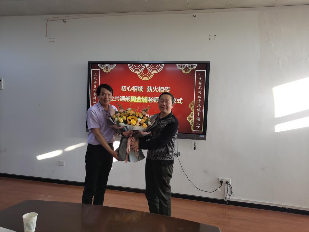 当天下午,一场温情四溢的荣退仪式在博学楼三楼会议室举行。公共课部党总支书记陈建波等行政干部和数学教研室全体教师一起,用简单朴实而不失温馨隆重的仪式,共同欢送为学校发展奉献39年芳华的周金城老师。