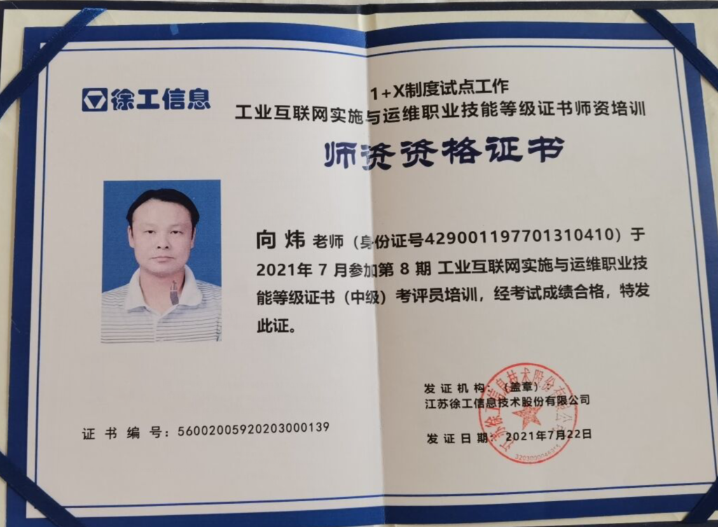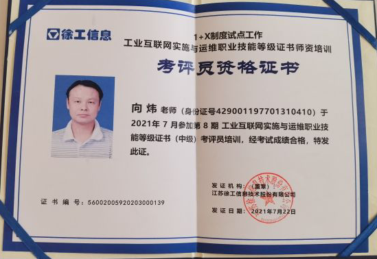 7月15日至23日,汽车工程学院智能控制技术专业向炜、赵昆、胡升耀、肖勇四名教师参加了由江苏徐工信息技术股份有限公司主办、浙江机电职业技术学院承办的工业互联网实施与运维职业技能等级证书培训。经过一周的理论加操作实践培训学习,四名教师顺利取得考评员资格证书。