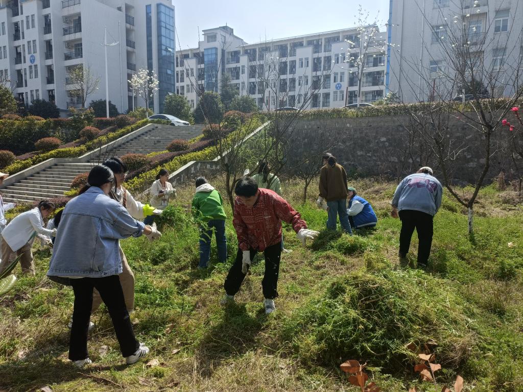 在植树节来临之际,3月9日,师范学院组织学生会、团总支、宿管会学生干部齐聚博爱楼后的桃李林。大家一起除草护树,现场一片欢声笑语。