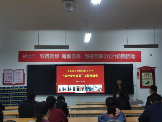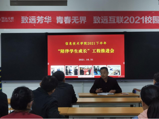 10月31日下午,信息技术学院在智造工业中心B栋401教室举行了2021下半年“陪伴学生成长”工程推进会。信息技术学院全体党员、班主任、结对帮扶学生、机关第一党总支第三党支部党员干部参加此次会议。