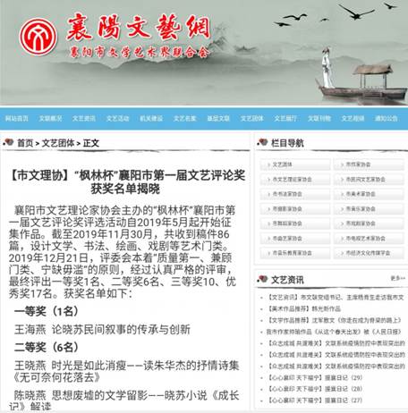 襄阳市第一届文艺评论奖具体情况详见襄阳文艺网:http://wl.xiangyang.gov.cn/content-650.html?from=singlemessage