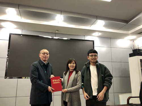 医学院院长温茂兴为2020年“老带新”师徒代表张韶虹、张智鑫颁发“老带新”结对聘书。