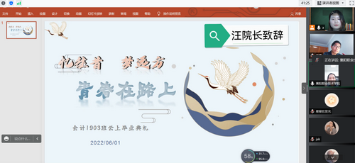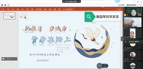 2022年6月1日晚,商学院22届各毕业班分别举行了线上毕业典礼。会计1903班毕业生相聚云端,在老师和家长的见证下,开展“忆往昔,梦远方,青春在路上”的毕业典礼活动,为因疫情不能返校的同学们3年的大学时光画上句点。