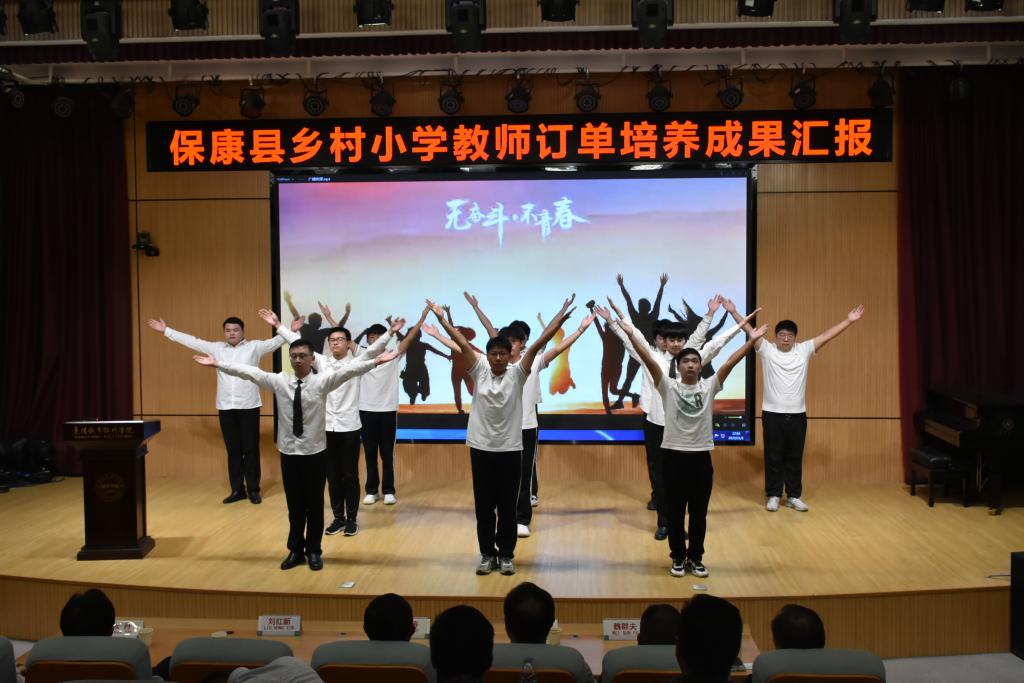 下午5时许,范友文一行来到博学楼报告厅,参加保康县乡村小学教师订单培养成果汇报会。会上,赵涛代表学校致欢迎辞,对保康县教育局常年支持订单培养、重视订单培养表示感谢。刘红新作《构建教师教育共同体 服务小学教师队伍高质量发展》主题报告,全面介绍保康县小学教育订单班人才培养工作。随后,由订单班学生自主编排的舞蹈、朗诵、钢琴、合唱等10个文艺节目依次登台亮相,向 来访的嘉宾展示了专业教育和素质拓展教育的成果。