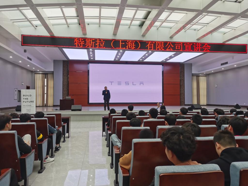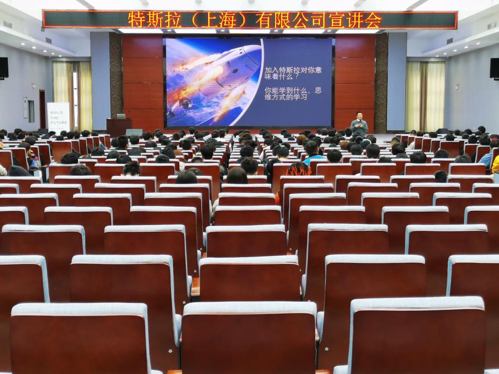 3月30日下午,特斯拉(上海)有限公司校企合作项目经理曾晨晨、企业大学培训经理潘玉春一行五人来到汽车工程学院,开展招聘宣讲。汽车工程学院党总支书记李先国、副院长向炜、就业办主任孙小芳及全体2019级学生参加了招聘宣讲。