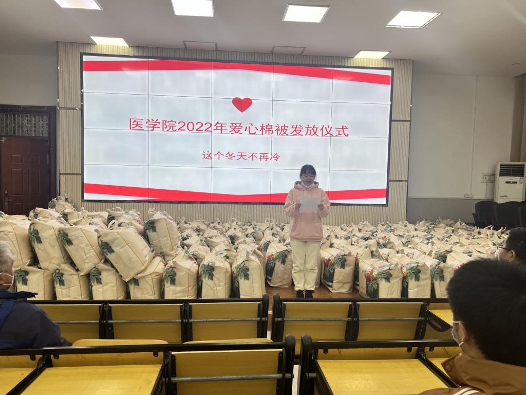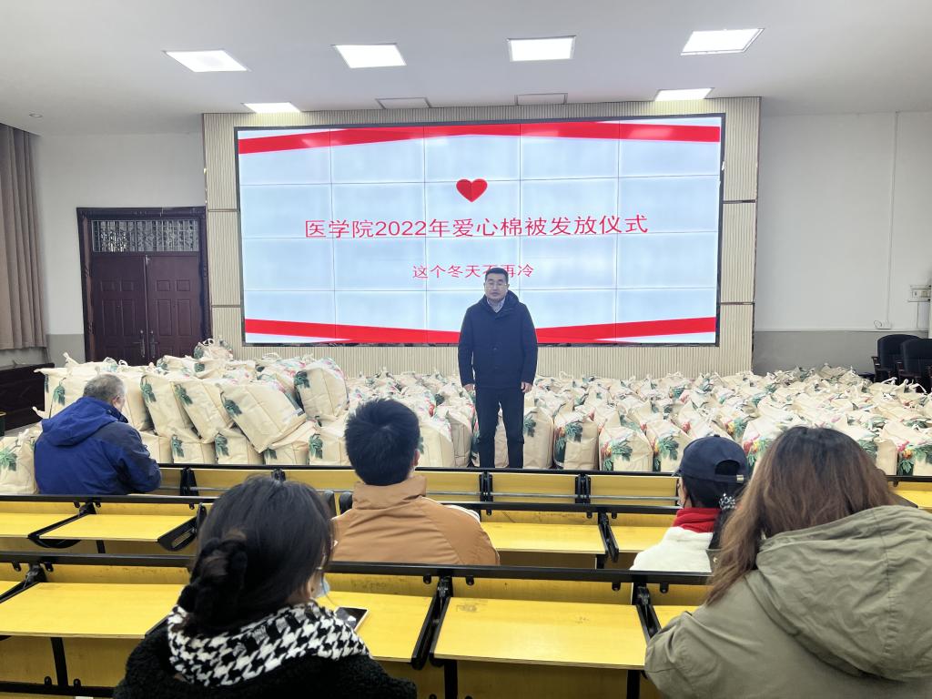 杨雷指出,近年来,医学院深入落实学校陪伴学生成长工程,学校领导、党员教师关心、关爱着每位困难学生,全程助力学生成长成才。此次爱心棉被的发放,传承了中华民族扶贫济困、团结友爱的传统美德,体现了学校的大爱文化,希望同学们注意防寒保暖、奋发励志,争做德才兼备、品学兼优的时代新人。