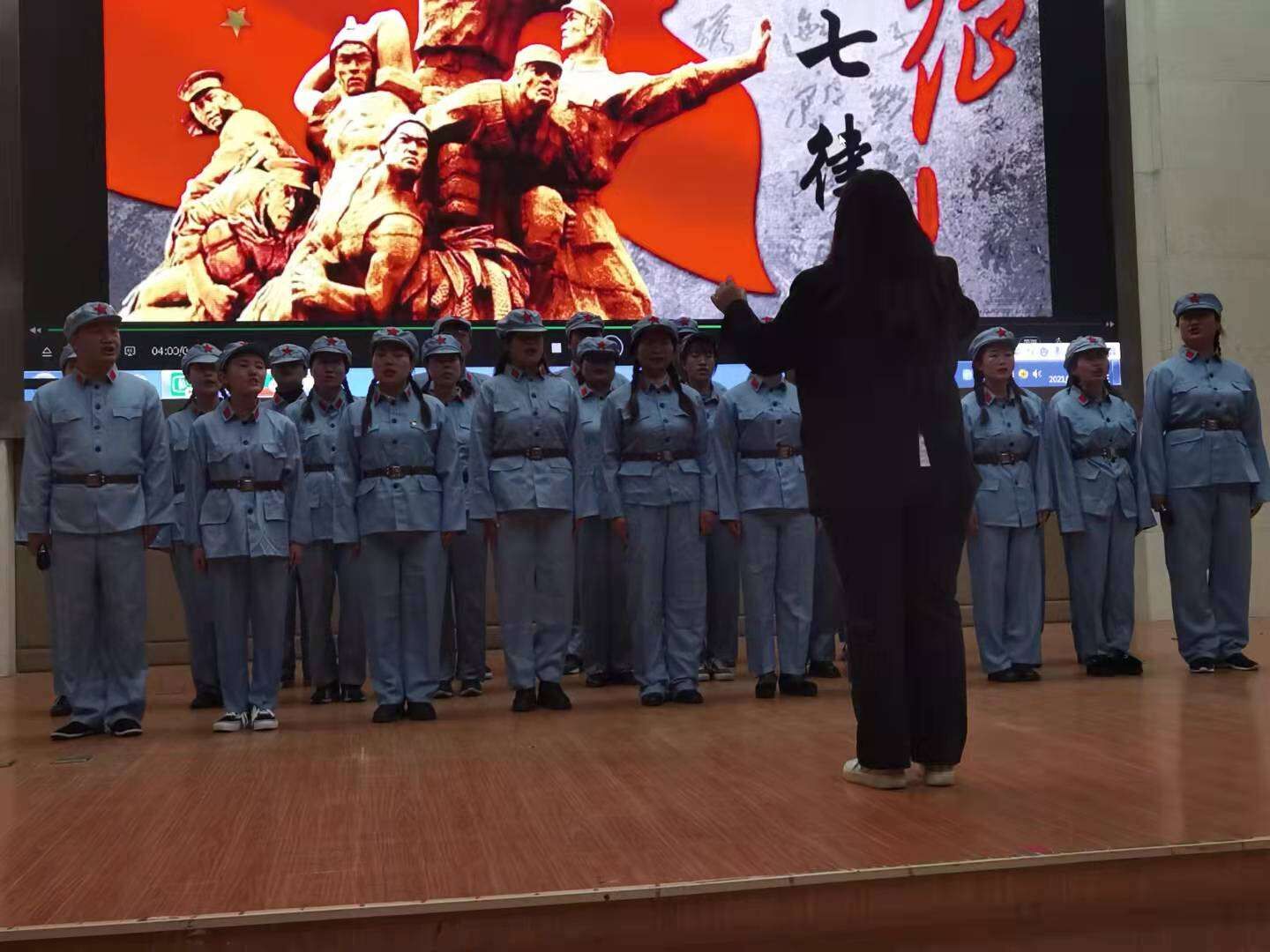 旅游管理2005班的全体同学表演了《人民军队忠于党》的歌唱与朗诵。他们身着戎装,背上扛枪,歌声朗朗,场面感人。