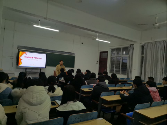 2022年2月20日18点30分,中专部学生干部培训会在博学楼W22教室召开。会议由学工科长徐琛主持。
