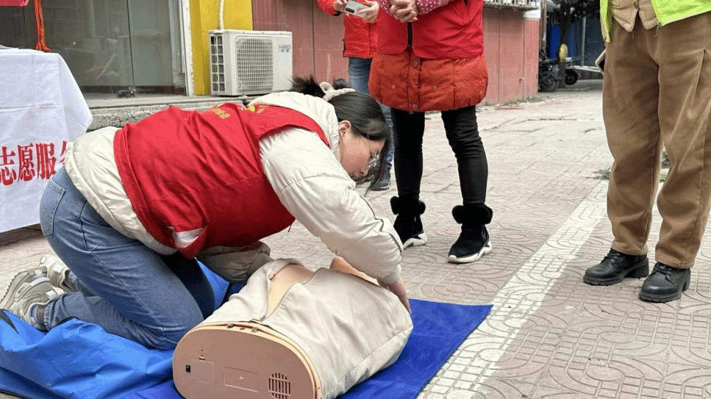 上午9点,20名红十字志愿者来到真武山街道慧苑社区,开展血糖、血压检测,进行心肺复苏演示,宣传心理健康知识。