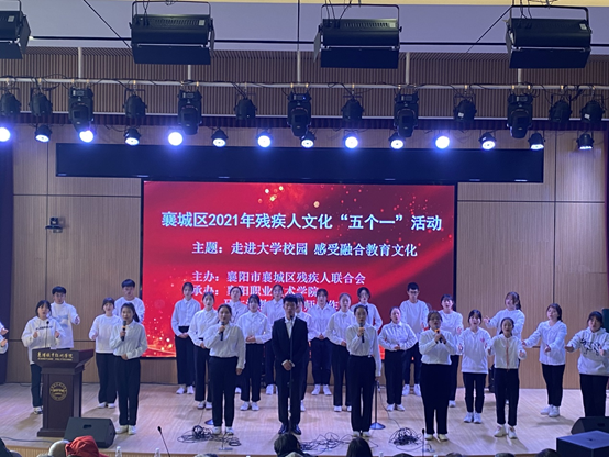 为丰富残疾人精神文化生活,增强残疾人精神文化的获得感与幸福感,襄城区残疾人文化进大学“联爱襄职 五个一”活动在主校区举行。“五个一”即组织残疾人看一场电影,参观一次展览,观看一场文艺演出,开展一次游园活动,送一本书。此次活动由襄城区残疾人联合会主办,我校承办。主题为感受大学校园文化,体会融合教育魅力。襄城区残疾人联合会理事长何慧、学校特殊教育学院院长马仁海,襄城区残联工作人员及特殊教育专业志愿者参加活动。