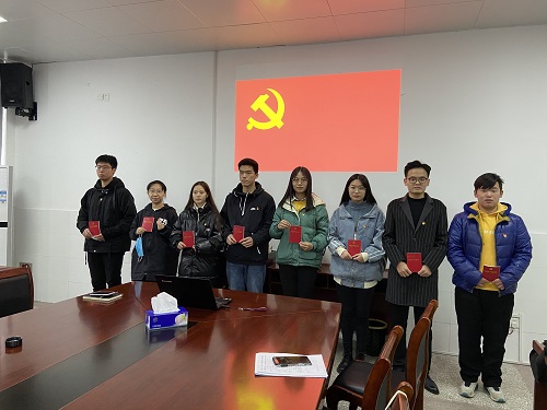 会上,学工党支部书记赵曦宣读党总支《关于接收姜晓雅等9名同学为中共预备党员的决定》。全体党员在朱新彧老师的带领下,面对党旗庄重宣誓。随后,预备党员代表和入党积极分子代表分别发言。二人表示,将会以一名优秀共产党员的标准严格要求自己,在学习生活和以后的工作当中,艰苦奋斗,实事求是,增长知识,提高自身素质。