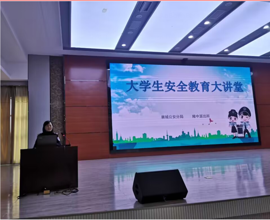 2023年春季开学以来,隆中派出所积极与我校对接,切实做好春季校园安全知识宣传巡讲进校园活动,多渠道、多方法、全覆盖,全力维护校园安全。3月7日下午4点30分,隆中派出所千山社区民警于淼(我校驻校片警)应邀到旅游与艺术学院开展安全教育讲座。院部全体在校生共330人聆听讲座。