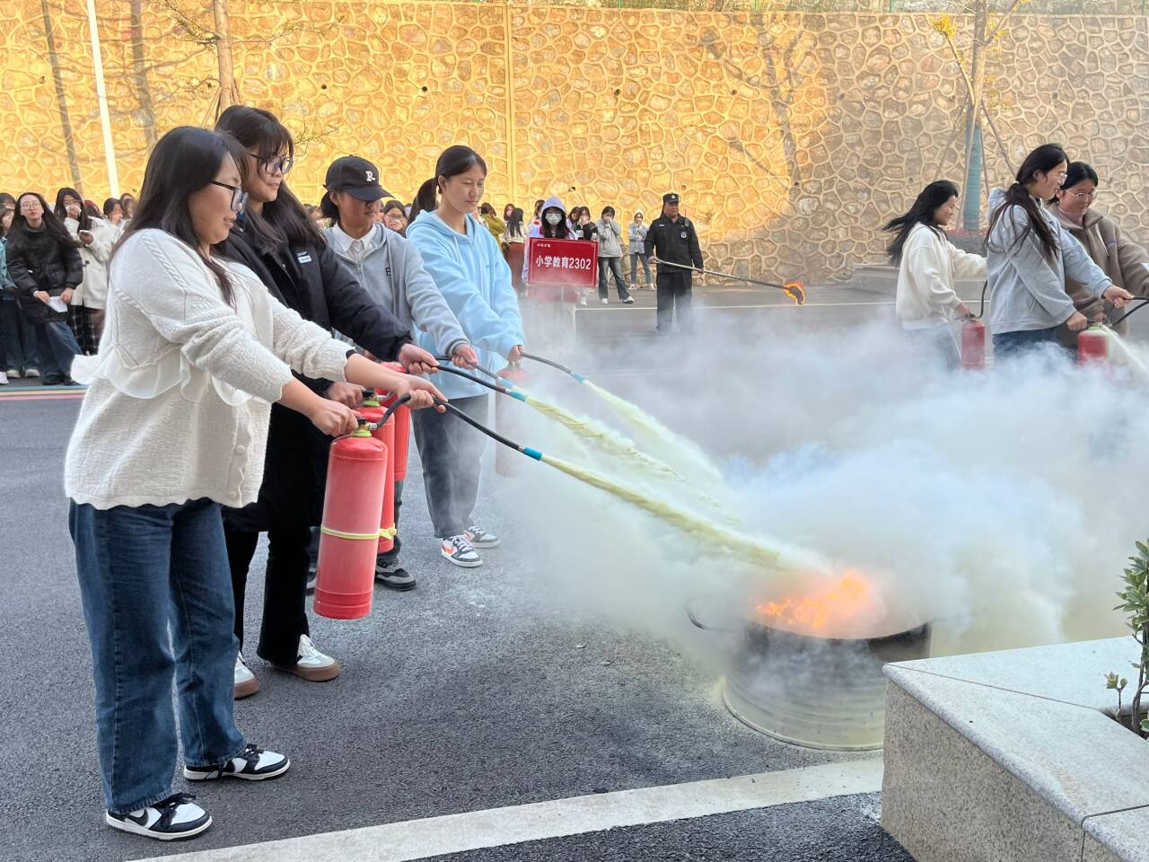 集合完毕,朱华兵对逃生演练总结点评,并向大家讲解灭火器的正确使用操作方法。80名学生分成10组现场演练灭火。