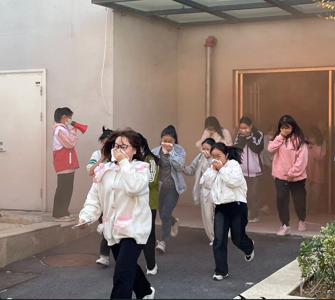 活动前,朱华兵对参加演练的学生开展培训。火灾警报拉响后,393名学生在每层楼学生干部的引导下,用湿毛巾捂住口鼻,按照既定的路线安全有序逃生、集合,整个活动用时1分32秒。