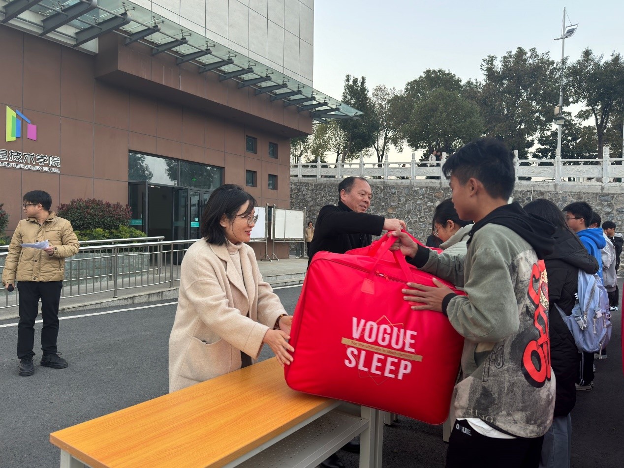 李书建在仪式上表示,爱心棉被发放是我校“奖、贷、助、补、减”政策之外的又一项关爱学生的活动,是为困难学生排忧解难的一项传统性活动。棉被虽然不是贵重之物,但它体现的是学校对学生的一种温暖,一份牵挂。受助学生表示,将牢记嘱托,刻苦学习,不负领导老师的期望,不断提高自身综合素质与专业技能,为学校高质量发展贡献自己的力量。