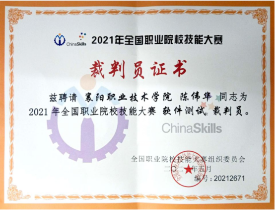 6月20日至6月21日,由教育部发起并联合相关部门、行业组织和地方共同举办的全国职业院校技能大赛高职组“软件测试”赛项在长春职业技术学院举行。经过教育部遴选,我院陈伟华老师被聘为该项赛事的裁判员,并圆满完成了此次裁判工作。