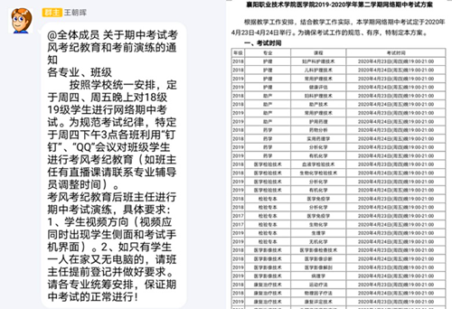 为保证考试公平公正,担任监考官的班主任们忙碌起来。考前,他们在班级群里发布考试通知、注意事项;开考了,他们登录钉钉群、QQ班级群,视频监考。有的老师还邀请家长进入班级钉钉群,辅助监考。教务科老师也按照各自的分工进入班级巡考。在相关部门的密切配合下,医学院期中线上考试顺利进行。