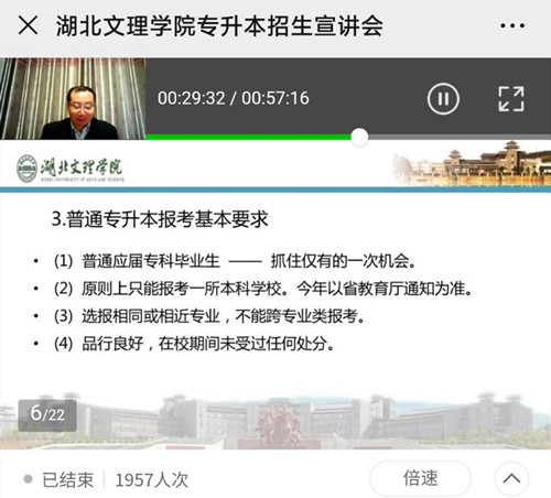 为让学生更好地了解专升本考试相关政策及动态,4月23日晚,汽车工程学院专升本工作小组组织35名有意向的考生参加了湖北文理学院2020年普通专升本网络宣讲会。