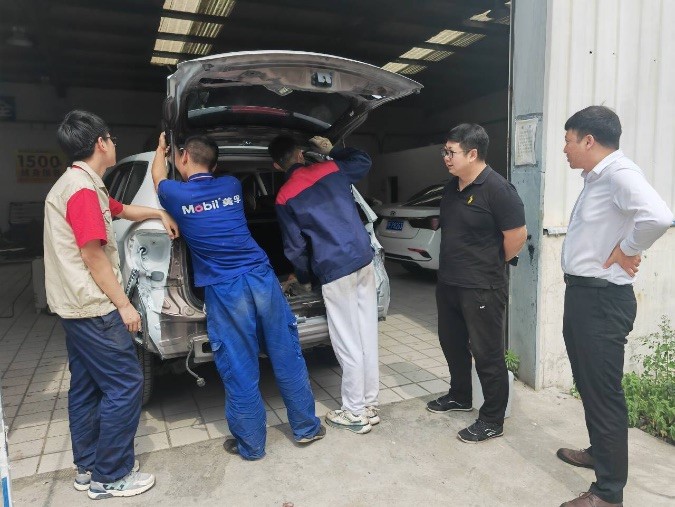 汽车工程学院2021级通用班于5月8日开始为期四周的校外轮岗实训。学员在企业帮带老师的指导下进行机修、钣金、机电等岗位的轮岗实习。近日,专业主任刘翔、学工科长王海光等来到学员实习站点,检查学生实训状况,并与学生、企业指导师傅、企业负责人就学员实习情况进行交流。